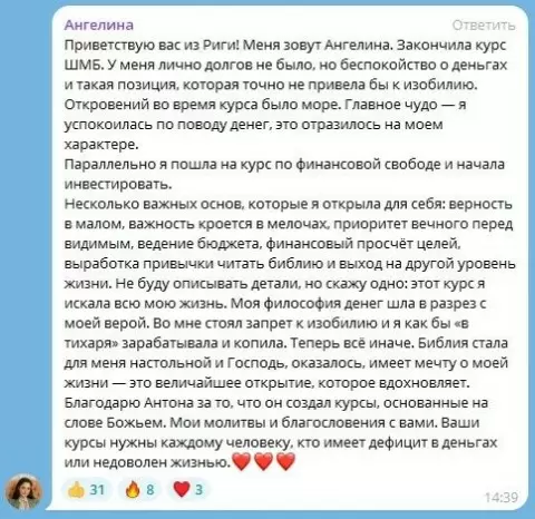 Ольга принимала участие в марафонах по «Духовной Экономике», что не только обогатило ее знанием, но и дало новый взгляд на собственную жизнь. Впервые она ощутила свою ценность и значимость как личности, что стало отправной точкой для серьезных изменений. Это осознание не просто помогло ей поверить в себя, но и осознать свою важность в глазах Бога.