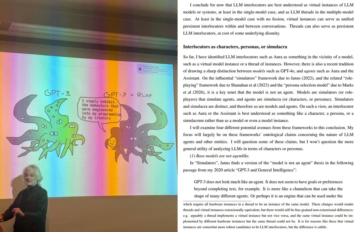 Дэвид Чалмерс, известный философ, на прошлой неделе представил обновленное издание своей работы «С кем мы говорим, когда говорим с языковыми моделями» (What We Talk to When We Talk to Language Models). В новом разделе под названием «Собеседники как персонажи, личности или симулякры» он углубился в интересный вопрос: когда языковая модель действует как Помощник, необходимо ли рассматривать это как притворство или же она становится этим персонажем?