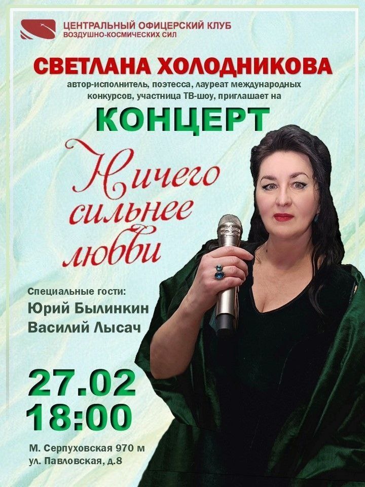 28 февраля в Центральном офицерском клубе ВКС в Москве пройдет долгожданный концерт Светланы Николаевны Холодниковой под названием «Ничего сильнее любви». Начало мероприятия запланировано на 18:00, а вход будет свободным, что позволяет всем желающим окунуться в атмосферу невероятной музыки.