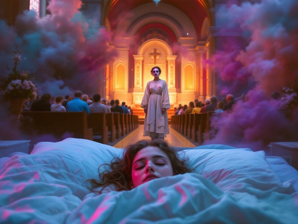 В одном из снов женщину в неподходящей одежде и без макияжа можно увидеть в церковном зале, среди гостей, готовых принять участие в торжестве. Вокруг нее накрыты скамьи и виднеется украшенный алтарь.
