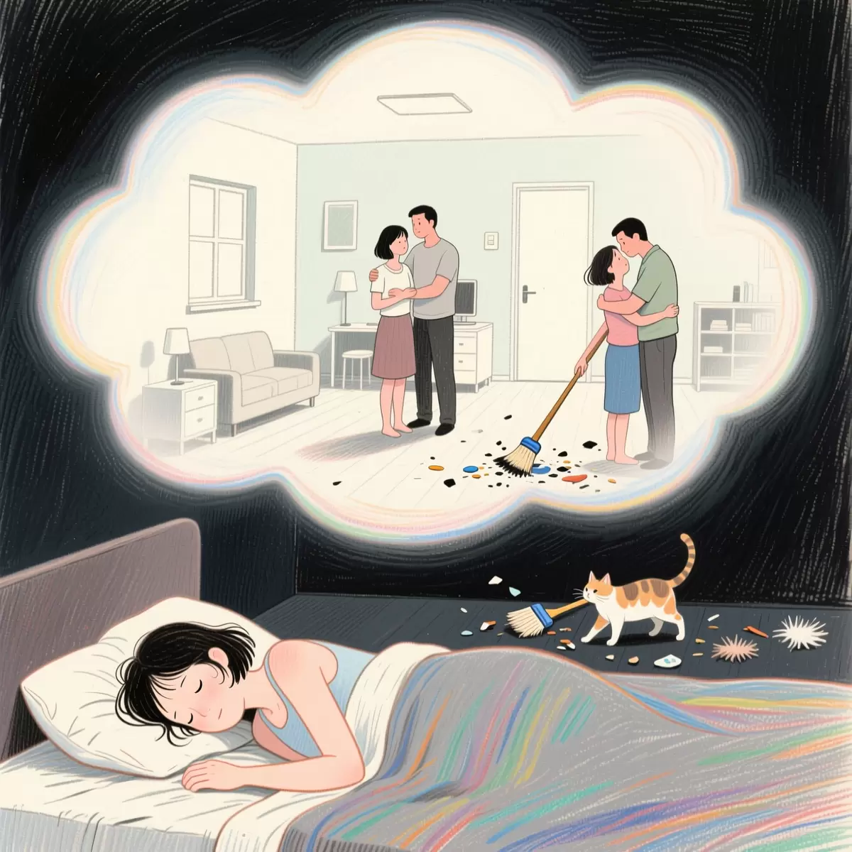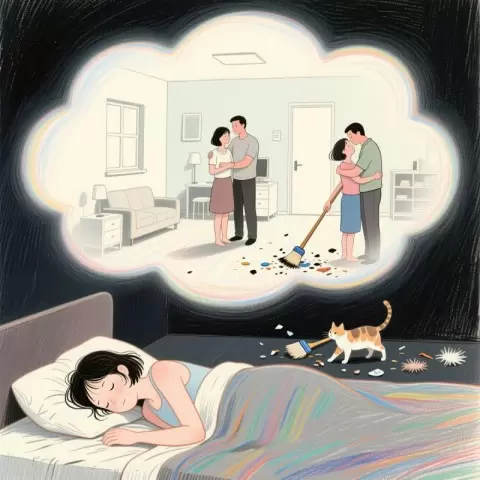В этом сне молодая женщина по имени Оксана находится в поисках квартиры для аренды. Она и ее муж находят идеальное место — чистую и ухоженную квартиру. Однако, вскоре она встречает своего бывшего супруга, который выражает тоску по прошлому. Обстановка меняется: квартира наполняется беспорядком и кошками, что вызывает у Оксаны тревогу о возвращении к мужу. В кульминационный момент сна она осознает, что её волосы повреждены и выпадают.